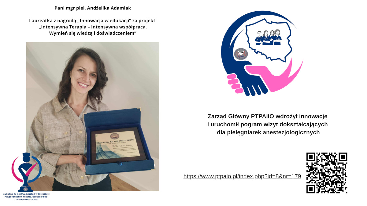 Pani mgr piel. Andżelika Adamiak (Oddział Warmińsko-Mazurski PTPAiIO) otrzymała nagrodę w kategorii „Innowacja w edukacji” za projekt „Intensywna Terapia – Intensywna współpraca. Wymień się wiedzą i doświadczeniem”, który promuje dzielenie się wiedzą i wspólne doskonalenie zawodowe.
