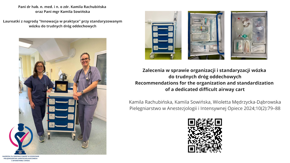 Pani dr hab. n. med. i n. o zdr. Kamila Rachubińska oraz Pani mgr piel. Kamila Sowińska (Oddział Zachodniopomorski PTPAiIO) zostały nagrodzone w kategorii „Innowacja w praktyce” za wdrożenie standaryzowanego wózka do trudnych dróg oddechowych (DAT – Difficult Airway Trolley), usprawniającego pracę zespołów medycznych i zwiększającego bezpieczeństwo pacjentów.