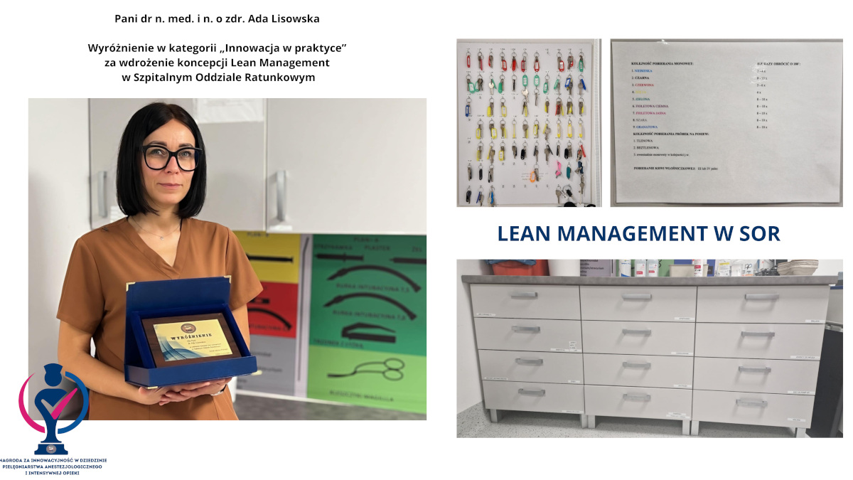 Pani dr Ada Lisowska (Oddział Opolski PTPAiIO) otrzymała wyróżnienie za wdrożenie koncepcji Lean Management w Szpitalnym Oddziale Ratunkowym, które przyczyniło się do poprawy efektywności i jakości pracy zespołu.