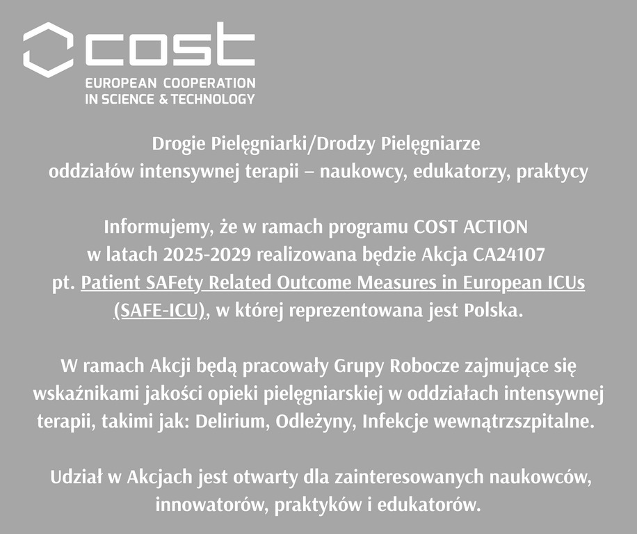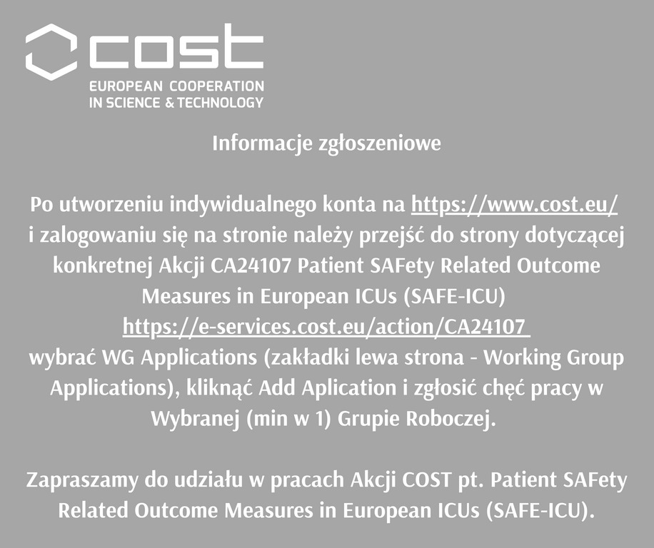 Informujemy, że w ramach programu COST ACTION w latach 2025-2029 realizowana będzie Akcja CA24107 pt. Patient SAFety Related Outcome Measures in European ICUs (SAFE-ICU), w której reprezentowana jest Polska.