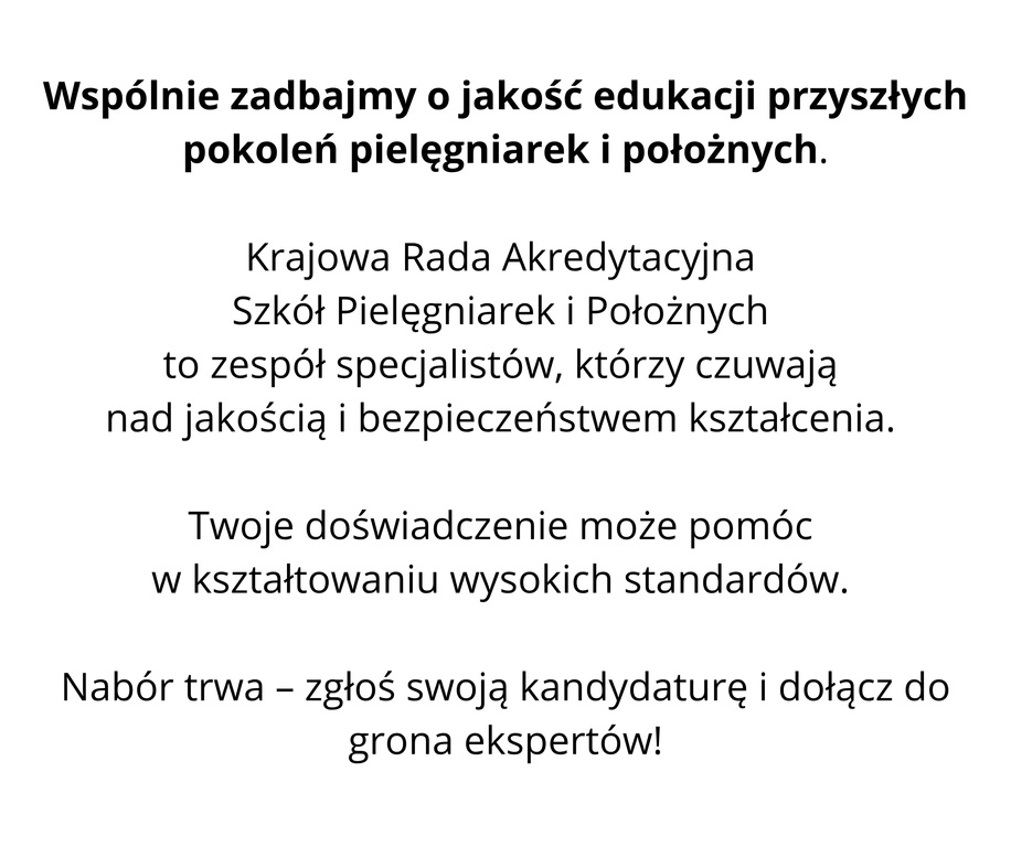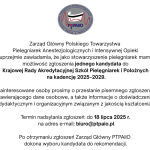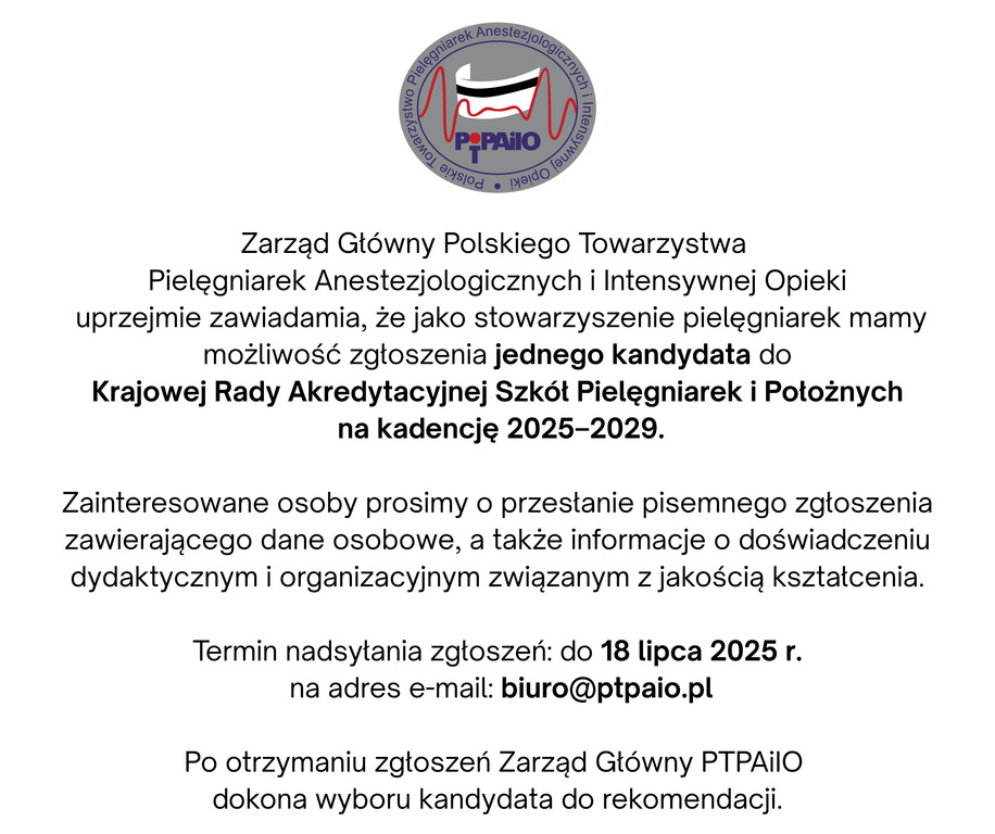 Zarząd Główny Polskiego Towarzystwa Pielęgniarek Anestezjologicznych i Intensywnej Opieki uprzejmie zawiadamia, że jako stowarzyszenie pielęgniarek mamy możliwość zgłoszenia jednego kandydata do Krajowej Rady Akredytacyjnej Szkół Pielęgniarek i Położnych na kadencję 2025–2029.